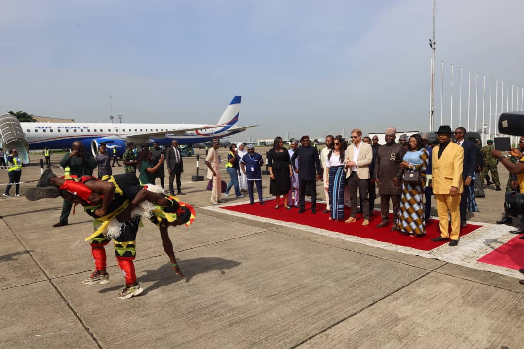 The Sussexes and their entourage were on board an Air Peace charter flight, operated with one of the airline’s brand new Embraer 195-E2 aircraft, to Lagos from the country’s capital where they arrived on Friday.